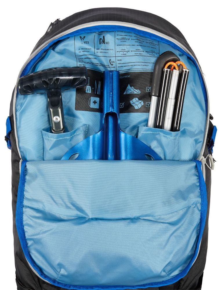 L’accès au compartiment principal se fait par une fermeture éclair arrière, évitant ainsi que la neige n’humidifie le sac ou n’entre à l’intérieur. Le sac dispose de compartiments séparés pour la pelle et la sonde avalanche, ainsi que d’un logement rembourré pour lunettes de ski ou de soleil.