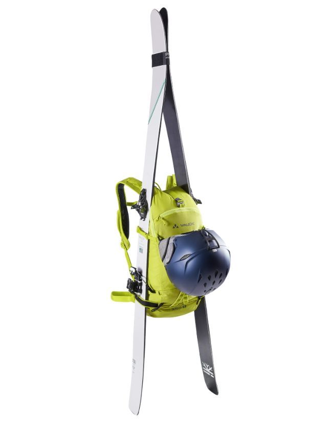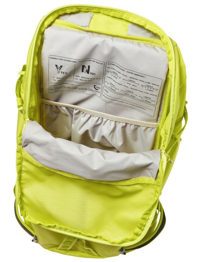 Le compartiment principal s’ouvre rapidement grâce au zip vertical et accueille également le rescue bag amovible avec l’équipement avalanche. Le sac peut être efficacement comprimé pour un transport plat. Les skis peuvent se fixer sur le côté, les bâtons ou un piolet sur l’avant. Un porte-corde escamotable et des boucles pour casque complètent l’organisation.