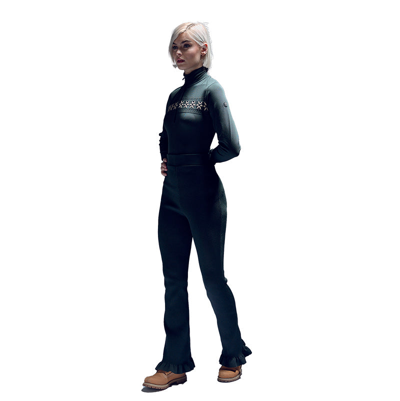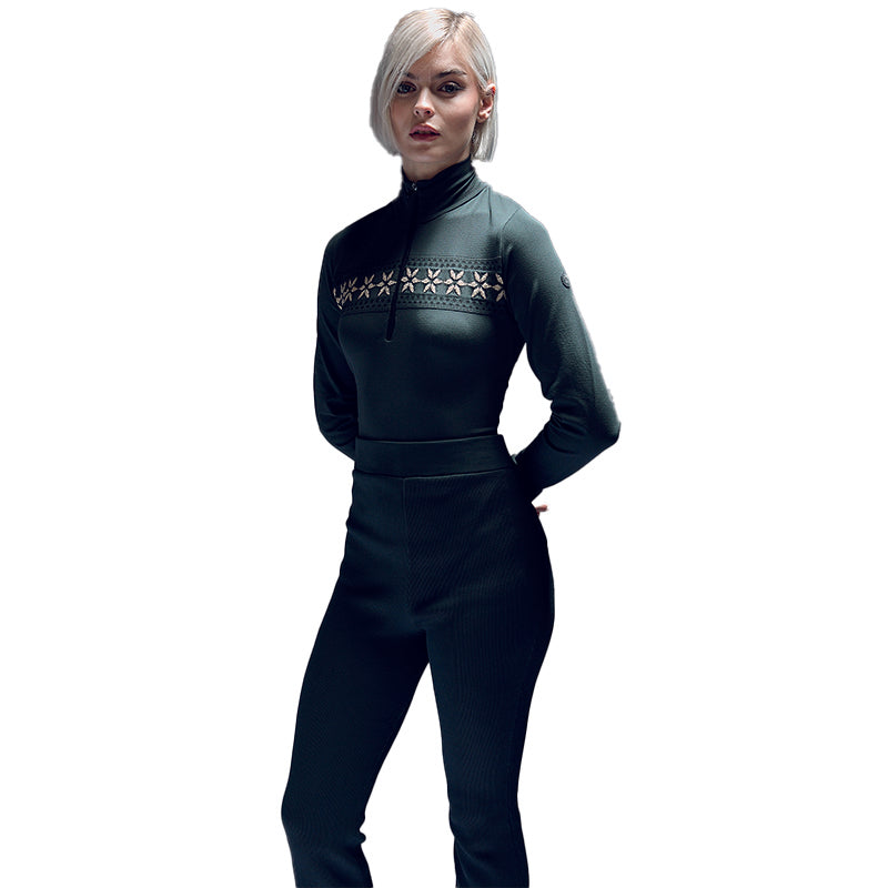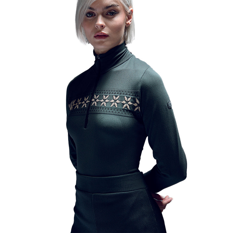 Son motif jacquard norvégien rehaussé de fils Lurex apporte une touche d’élégance raffinée, tandis que sa construction sans coutures assure un ajustement confortable et près du corps. Le col montant demi-zip permet de moduler la ventilation selon votre activité, que vous soyez sur les pistes ou en après-ski.